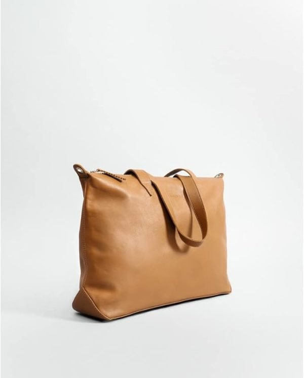 EVERYDAY – LACAMBRA – Spanis Brand- Camel Big soft bag made in cowhide leather. Outer zipper closure and inside pocket with zipper. Middle size handle, can be carried as a shoulder bag. The inside has a rigid base and a cotton inside pocke t with a zipper, the rest of the bag is without lining, making it very light and soft. Includes a large strap to carry it as a cross body bag. Size: 41 x 30 x 11 cm Handmade in Spain