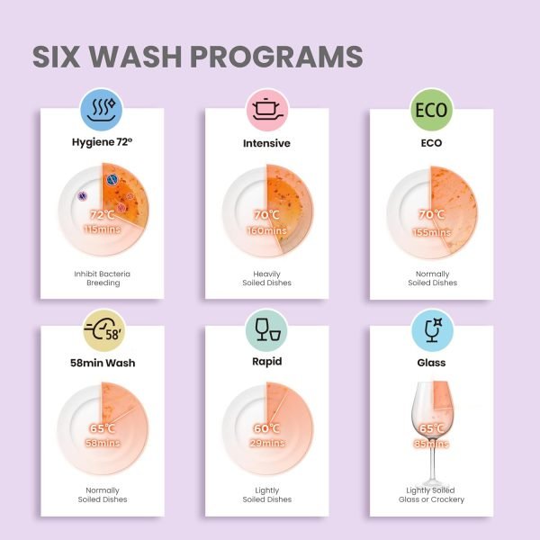 【Six Washing Cycles】With multiple cleaning options, including Hygiene 72°, Intensive, ECO, Glass, 58min Wash, and Rapid, the dishwasher provides high flexibility to deliver the best cleaning results, within a time which is most convenient for you